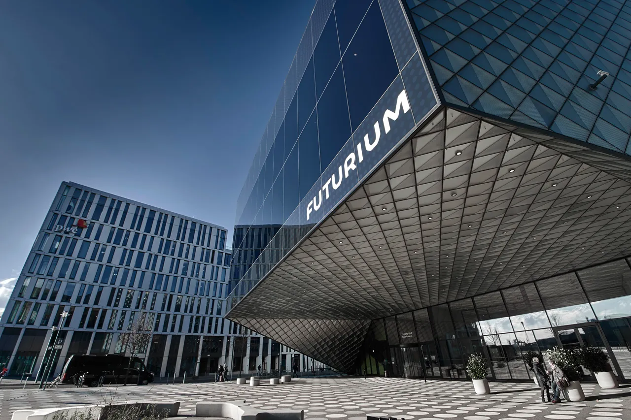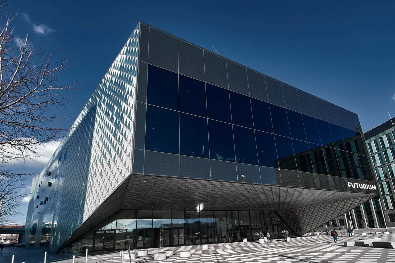 FUTURIUM From the Berlin S-Bahn heading toward the city centre, the shimmering façade of this modern event and museum building breaks through the urban monotony. Inside, the towering black exposed-concrete walls push each exhibition into the spotlight.